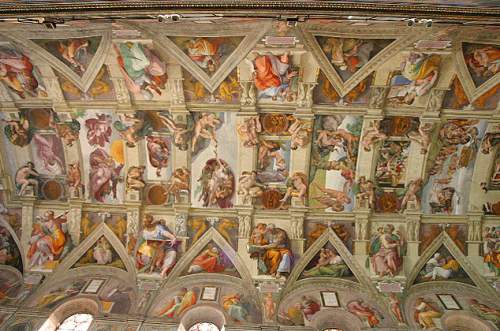 1508 beauftragte Papst Julius II. Michelangelo damit, das Gewölbe auszumalen. Bis 1512 schuf dieser eine gemalte Architektur, in die einzelne Bilder eingebettet sind. Im der Mitte sehen wir neun Szenen aus der Genesis, abwechselnd in großen und kleinen Gemälden. Von der Altarwand aus sind das: